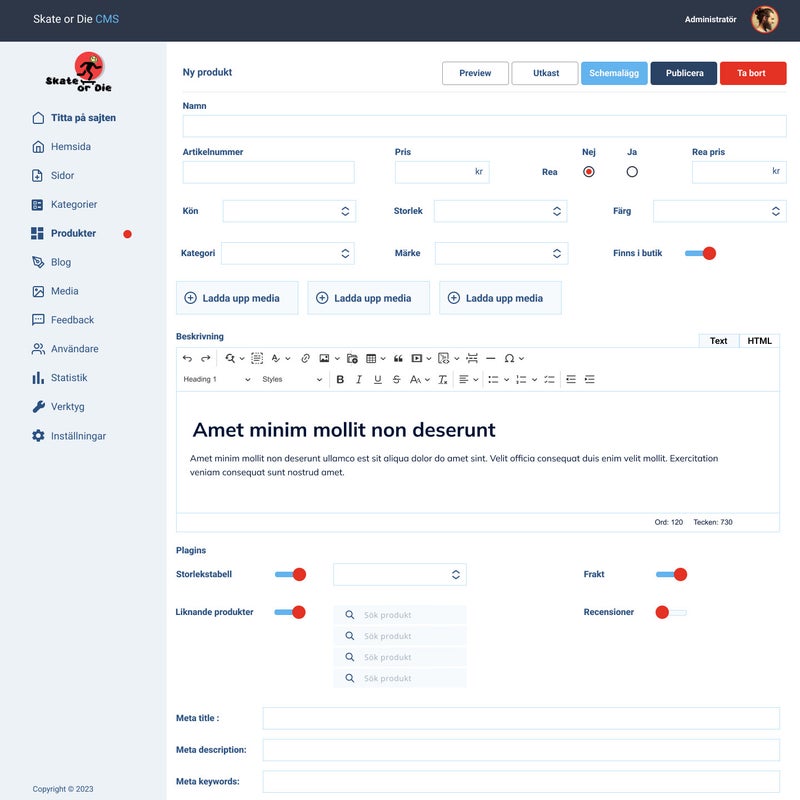 When developing the CMS, I focused on the needs of business owners and content managers who typically work on desktop computers in offices or from home. Managing an e-commerce site with numerous products on a mobile device is inconvenient and time-consuming, so here I prioritised a desktop-first design for efficiency. Main solutions include: